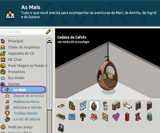 Hoje pela manhã o Habbo Hotel retornou alguns móbis antigos. como por exemplo o mobi antigo " Cadeira de cafofo". no valor de 5 câmbios.No catalago clique em Stories apos isso abrira a aba " As mais". pronto você poderá adquirir o mobi cadeira de cafofo.